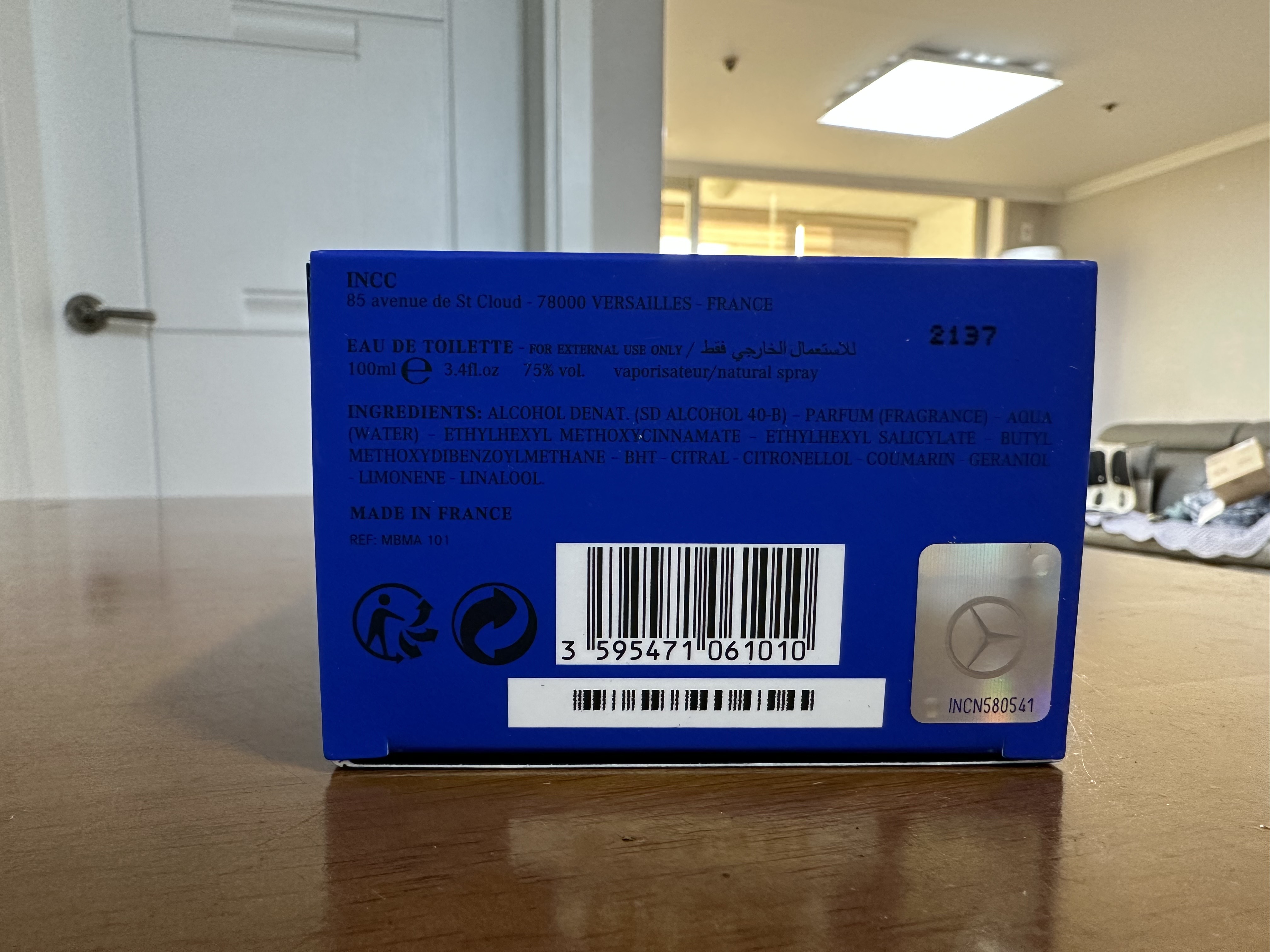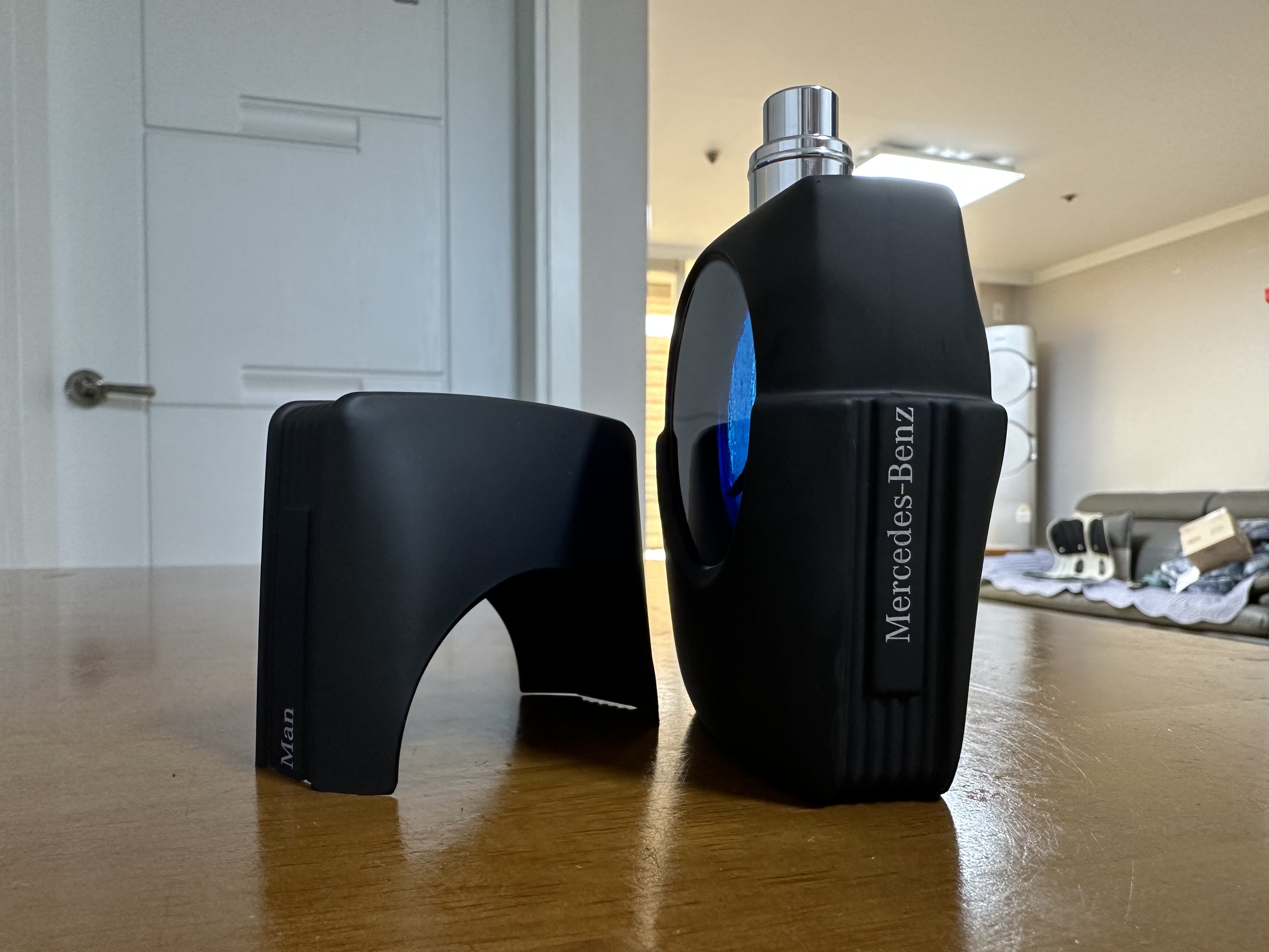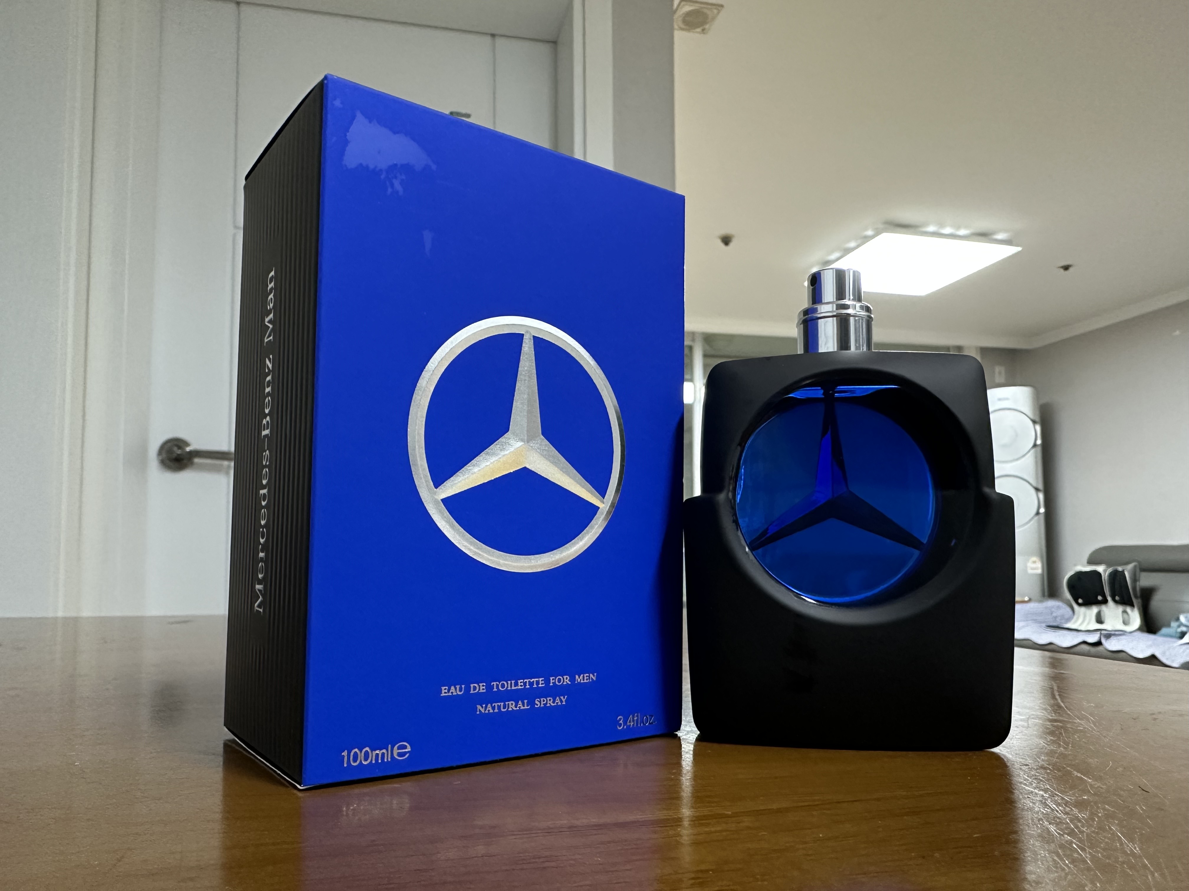 블랙 가운데 로고 또한 벤츠 로고가 보이고 안에는 블루칼라의 향수가 보이네요.. 어쩌면 칼라의 조화가 너무 잘 맞는 것 같습니다..